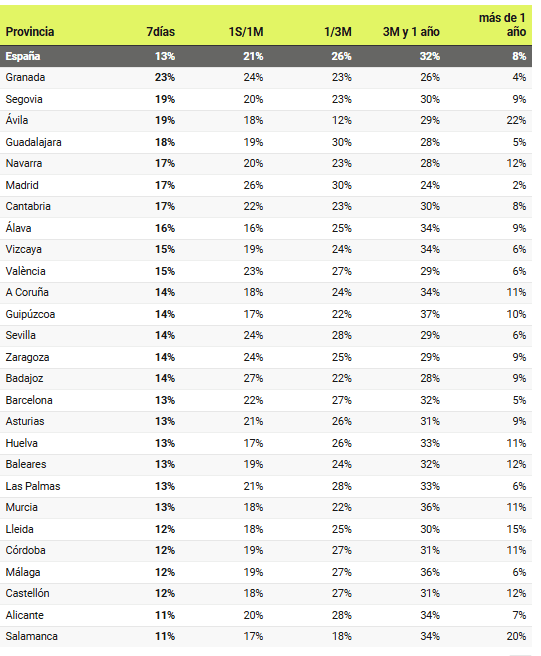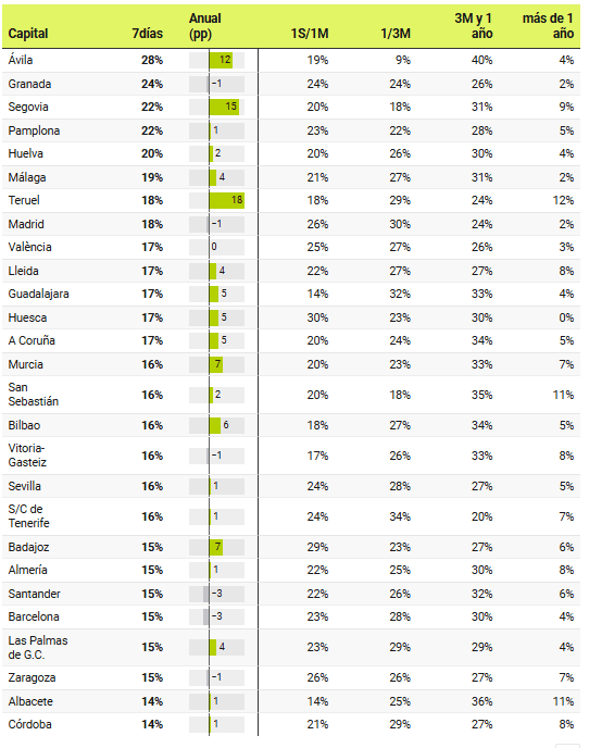 Les ventes express sont plus fréquentes dans les capitales. C’est à Ávila que le pourcentage le plus élevé de ventes en moins d’une semaine a été enregistré, avec 28 % des biens vendus en moins de sept jours. Viennent ensuite Grenade (24 %), Ségovie (22 %), Pampelune (22 %), Huelva (20 %), Malaga (19 %), et Teruel et Madrid (18 % dans les deux cas). Viennent ensuite Valence, Lleida, Guadalajara, Huesca et La Corogne (17 % dans les cinq cas). Parmi les autres grands marchés, ce phénomène touche 16 % des ventes à Saint-Sébastien, Bilbao et Séville, tandis qu’il se maintient à 15 % à Barcelone, 12 % à Palma et 11 % à Alicante.