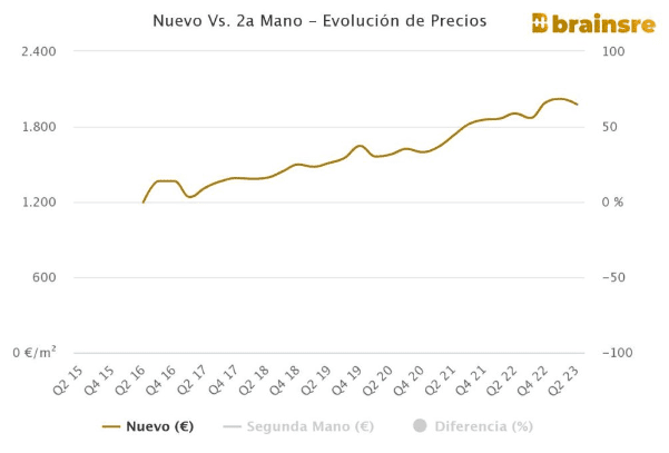 Le prix des logements neufs à Entrenúcleos s’élève à 1.977€ par m2 en moyenne, ce qui représente une augmentation de 3,8% en comparaison annuelle, mais une baisse de 2,1% en glissement trimestriel, selon les données de la plateforme immobilière big data Brainsre.