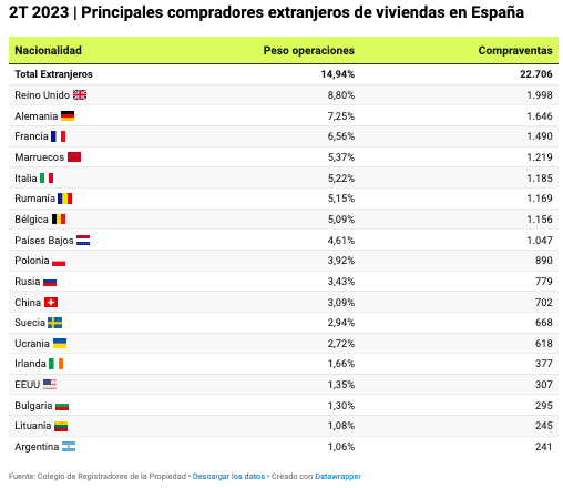 Cependant, si le poids relatif des Britanniques a diminué, les ventes de logements par les étrangers, en général, non seulement n’ont pas baissé, mais ont atteint des chiffres exceptionnels. Outre les Britanniques (8,80%), les poids les plus élevés au cours du deuxième trimestre 2023 ont été enregistrés chez les Allemands (7,25%), les Français (6,56%), les Marocains (5,37%), les Italiens (5,22%), les Roumains (5,15%), les Belges (5,09%) et les Néerlandais (4,61%), ce qui se traduit par des transactions en termes absolus de plus d’un millier d’habitations achetées :