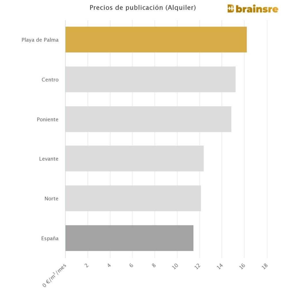 Le quartier Playa de Palma à Palma a le prix de location le plus élevé de toute la ville, avec une moyenne de 16,20 €/m2/mois. Il convient également de noter que le prix est à son plus haut niveau historique après des hausses consécutives depuis le troisième trimestre de 2021.