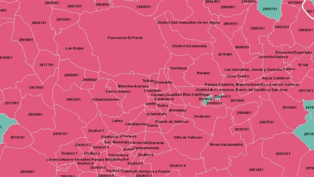 Avec les nouveaux changements qui vont être adoptés, si une seule des deux conditions est remplie, tous les districts qui composent la capitale seront considérés comme des zones tendues, comme on peut le voir sur la carte ci-dessus, où toutes les zones de Madrid sont en rose. Il reste à décider si la désignation de “zone tendue” s’appliquera à l’ensemble de la municipalité ou si elle pourra être modulée en fonction des quartiers ou même des secteurs de recensement.
