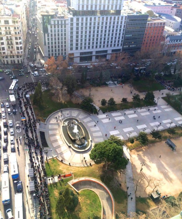 La queue d’environ 500 mètres, selon les photos, s’étend de la rue Princesa, contourne le parc, et continue jusqu’à la rue Bailén, Les milliers de personnes qui attendent tiennent entre leurs mains des CV et des lettres de motivations. A la clé de cette interminable file d’attente : 100 offres d’emploi à pourvoir dans un hôtel installé depuis peu dans le centre-ville de Madrid. L’hôtel a convoqué les candidats pour un “casting”, selon ses propres mots, entre 10 heures et 17 heures aujourd’hui. Certains candidats commençaient déjà à abandonner la course en fin de matinée, epuisé par l’attente.