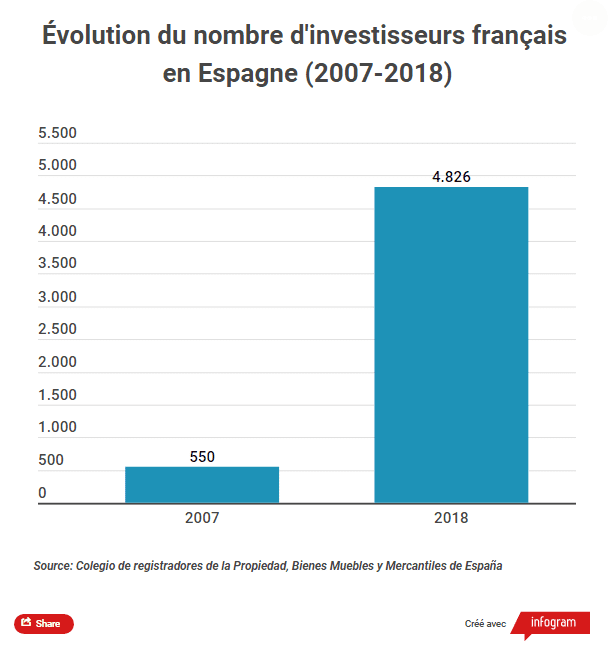 Depuis 2007, les Français représentent les premiers investisseurs étrangers sur la péninsule ibérique. De 550 en 2007, ils sont passés à 4.826 acheteurs en 2018 selon les chiffres officiels du Colegio de Registradores de la Propiedad y Mercantiles de España, représentant ainsi 7,39% des achats des étrangers. Et cette augmentation n’est pas prête de s’arrêter puisqu’elle semble également se confirmer sur l’année 2019.