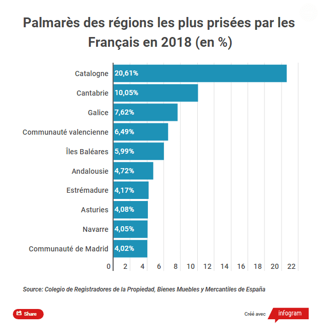 Parmi les régions les plus convoitées par les Français, on retrouve: la Catalogne (20,61%), la Cantabrie (10,05%), la Galice (7,62%), la Communauté valencienne (6,49%) et les îles Baléares (5,99%).