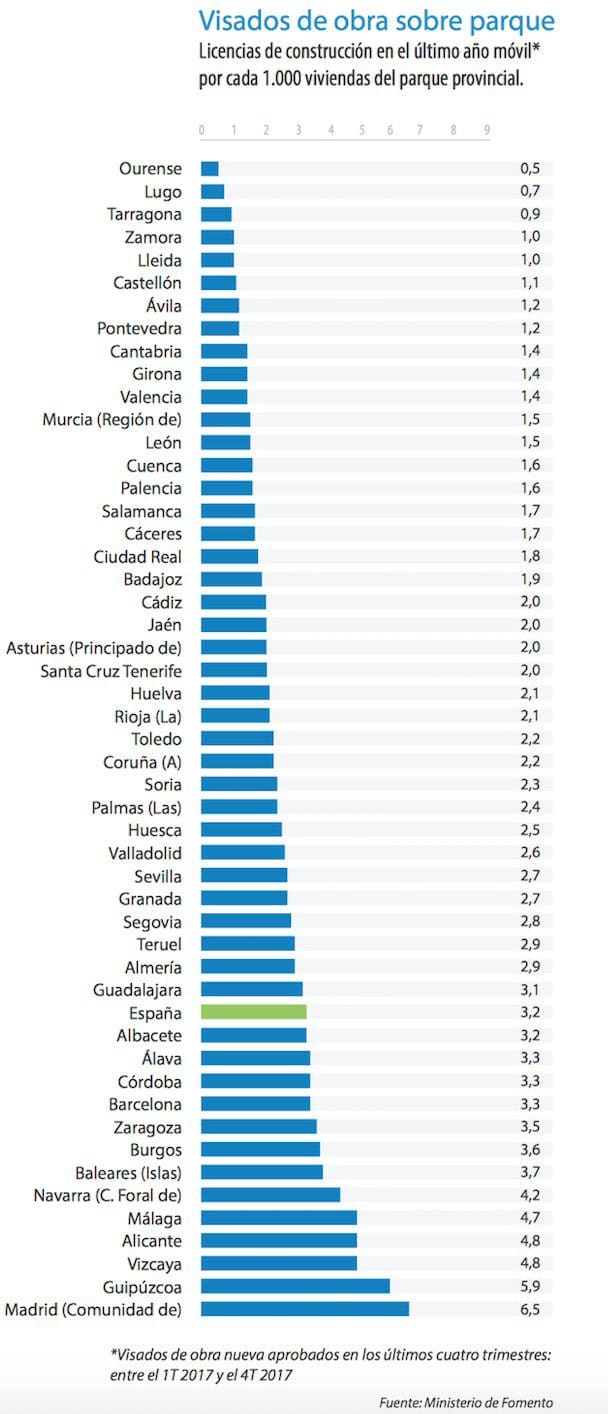 Madrid est en tête avec 6,5 nouveaux visas pour 1 000 maisons du parc et 5,9 pour Guipuzcoa. On retrouve en queue de liste Orense, Lugo et Tarragone. Les biens immobiliers se vendent et les promoteurs l’ont bien compris, d’autant plus que l’Espagne s’ouvre depuis peu à des promotions immobilières d’un style avant-gardiste.