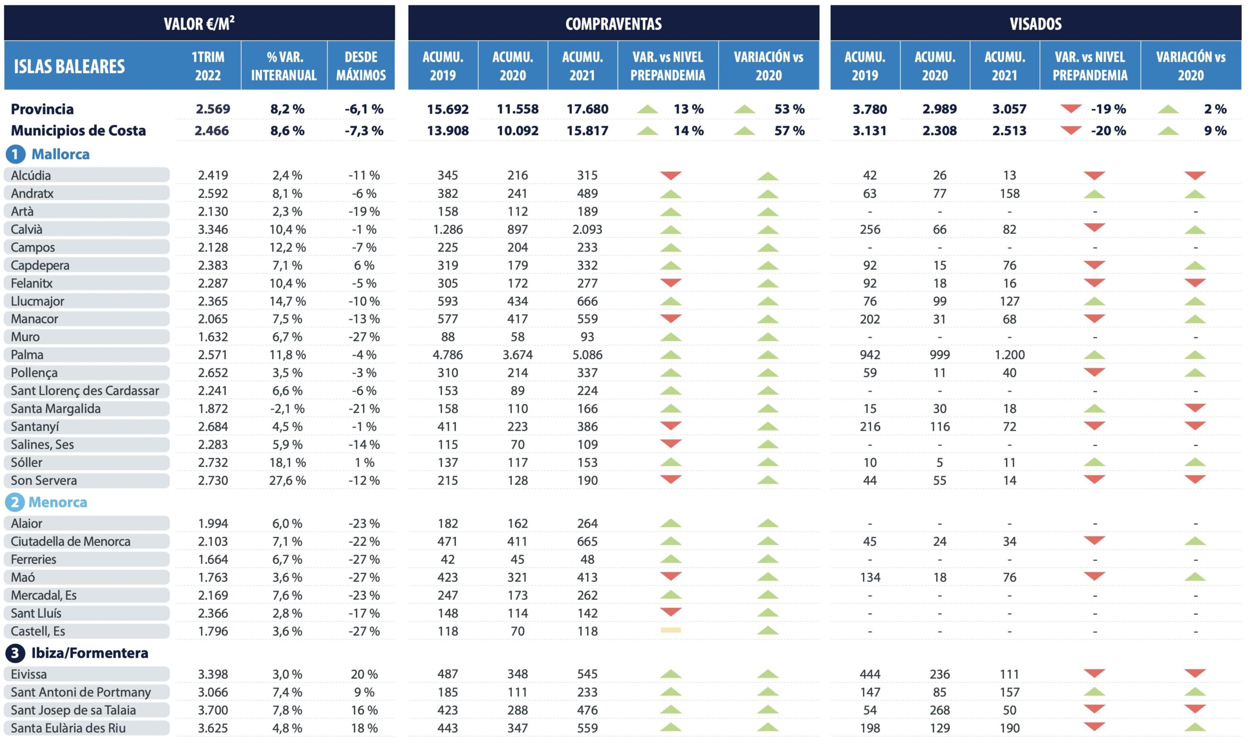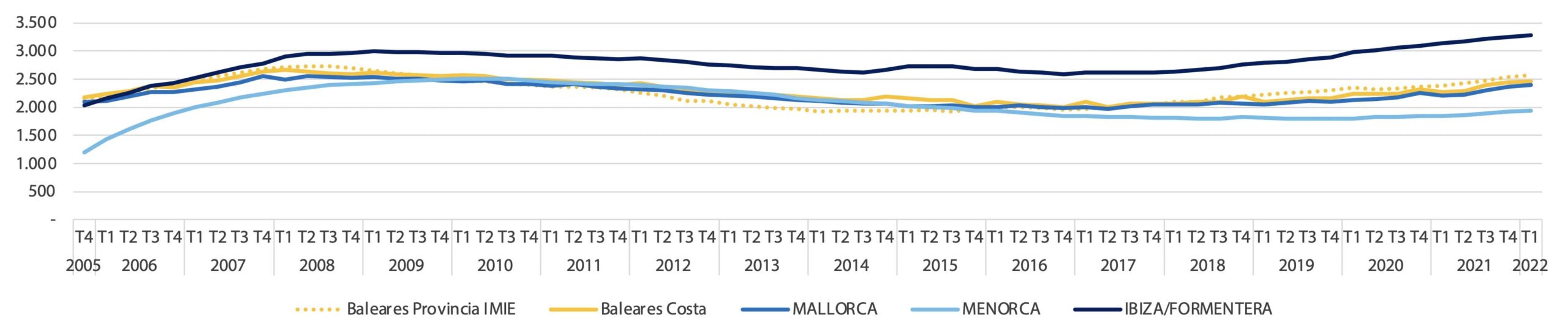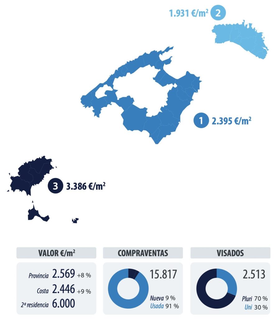 Le prix des résidences secondaires se situe entre -15 % à Minorque et 300 % à Ibiza au-dessus du prix des résidences principales. Les maisons de vacances multifamiliales coûtent en moyenne 5 000 €/m2 à Majorque, 2 100 €/m2 à Minorque et 5 000 €/m2 à Ibiza et Formentera. Les maisons unifamiliales dépassent largement ces chiffres et se situent autour de 7 000 €/m2 à Majorque, 3 000 m2 à Minorque et 10 000 €/m2 à Ibiza et Formentera. Dans les îles Baléares, les prix les plus élevés au niveau national sont observés sur l’île d’Ibiza, ainsi que la plus grande différence entre les prix des résidences principales et secondaires. La valeur moyenne des logements généraux dans les îles Baléares est de 2 466 €/m2.