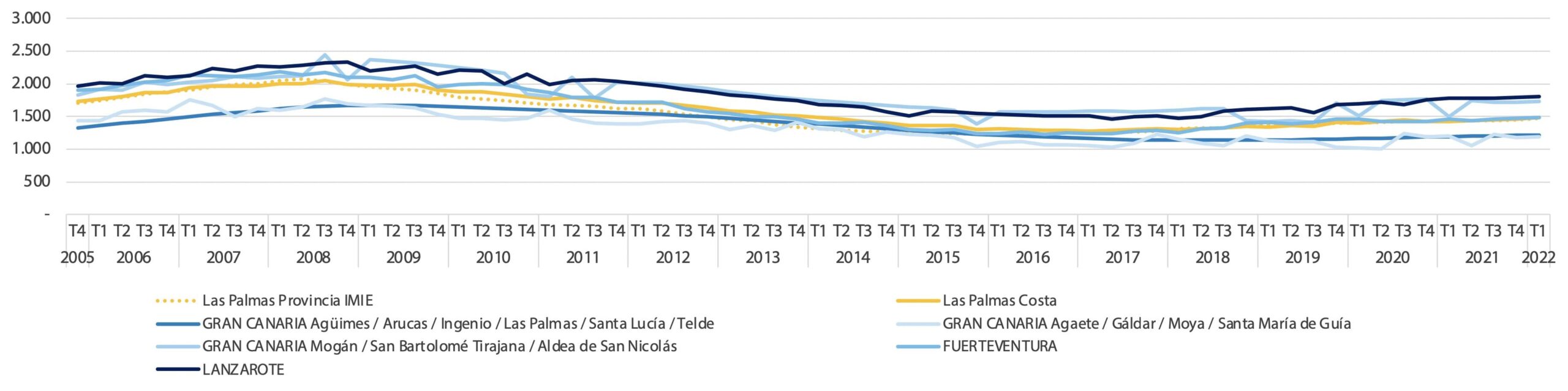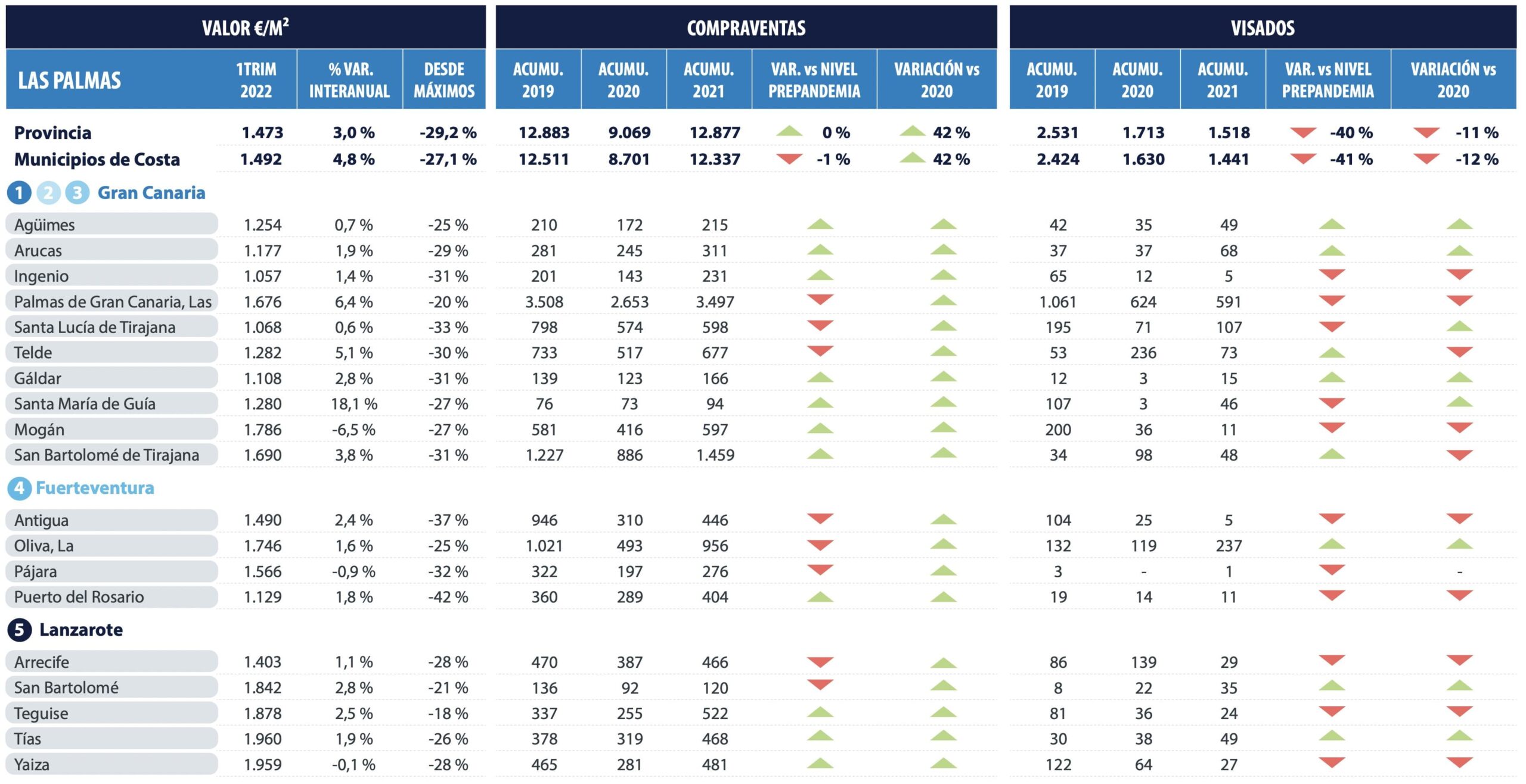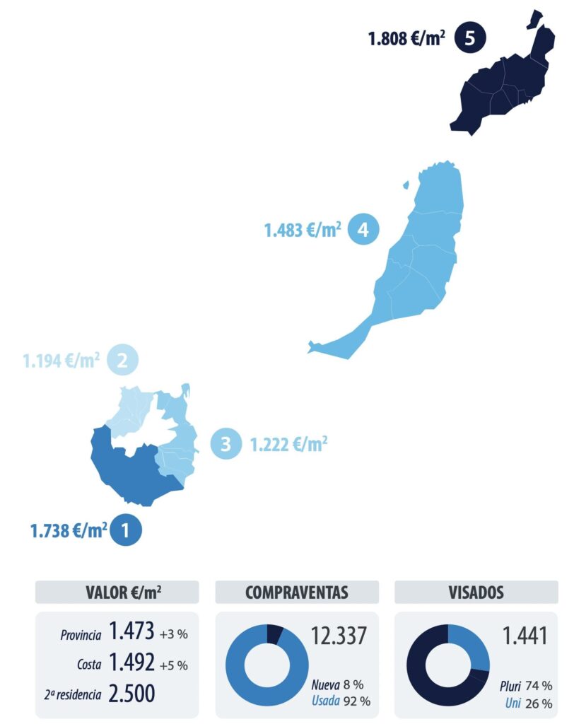 Le prix des résidences secondaires est entre le même niveau à Gran Canaria et 135 % plus élevé à Lanzarote que celui des résidences principales. Les maisons de vacances multifamiliales coûtent en moyenne 2 800 €/m2 à Lanzarote, 2 400 €/m2 à Gran Canaria et 2 200 €/m2 à Fuerteventura. Les maisons individuelles dépassent ces chiffres et se situent autour de 3 500 €/m2 à Lanzarote, 2 500 €/m2 à Fuerteventura et 2 100 €/m2 à Gran Canaria. La valeur moyenne des logements généraux dans les municipalités côtières de Las Palmas est de 1 492 €/m2.
