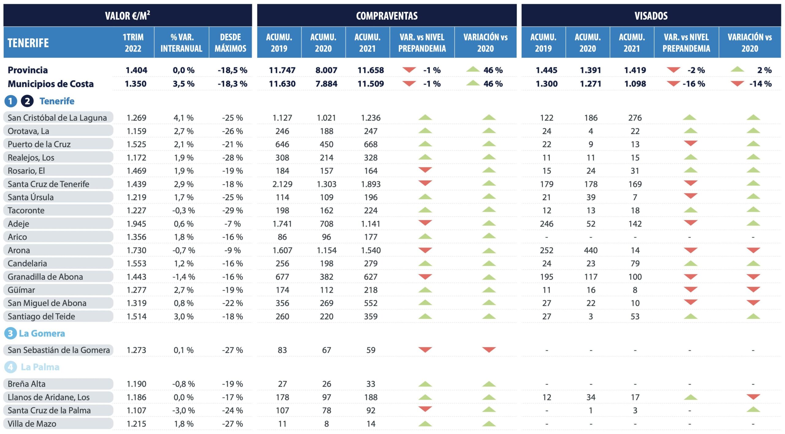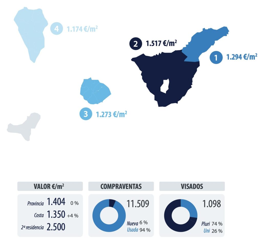 Le marché des municipalités côtières de Tenerife a un poids majoritaire en raison de son caractère d’archipel. Les ventes de biens immobiliers et les activités de développement représentent 95 % de l’activité totale de la province.