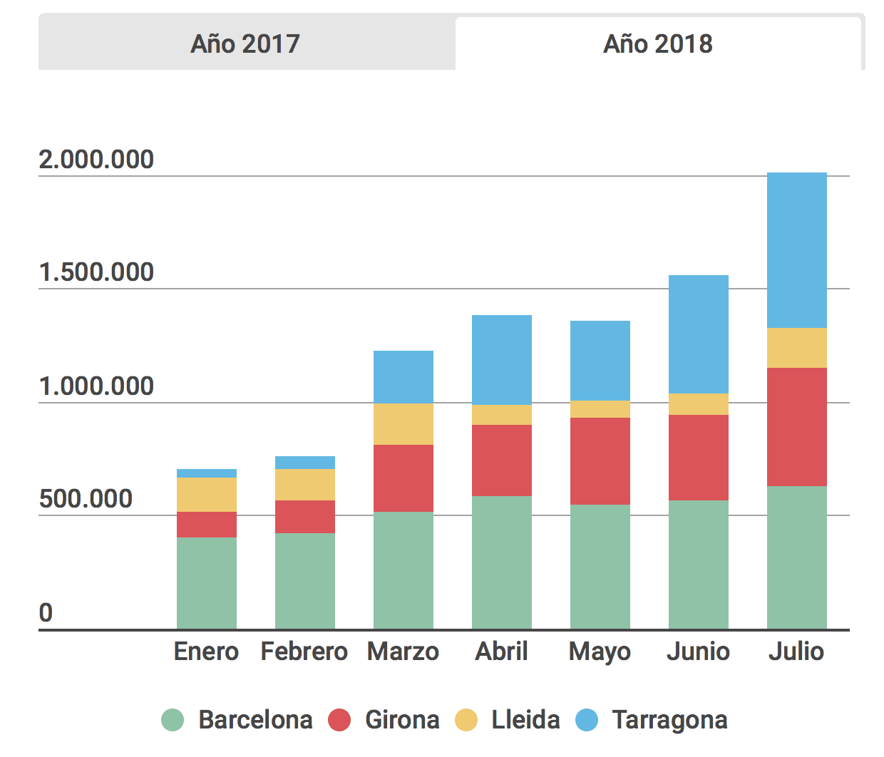 Cependant, cette baisse n’est pas homogène dans toutes les destinations mais se concentre principalement dans deux provinces: Barcelone (-9,87%) et Tarragone (-8%). En revanche, dans la région de Gérone, il n’y a guère eu de baisse (-0,4%) et dans les comtés de Lleida, il y a même eu une croissance de 4,7%. Cependant, lorsque le mois de juillet est arrivé, les chutes étaient plus répandues. Dans l’infographie interactive suivante, nous pouvons visualiser les données plus en détail. De janvier à juillet, les hôtels en Catalogne ont perdu au total un million de nuitées de voyageurs étrangers et espagnols par rapport à la même période l’an dernier.