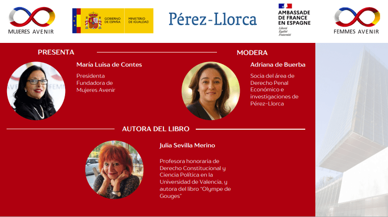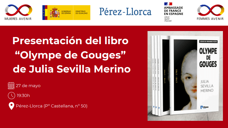 L’Association de Amistad Hispano Francesa Mujeres Avenir, présidée par María Luisa de Contes, présidente fondatrice, et Rebeca Ávila, présidente exécutive, présentera le 27 mai à 19h30, dans l’auditorium du cabinet Pérez-Llorca, situé au Pº Castellana nº 50, le livre qui vient d’être publié sur Olympe de Gouges, dont l’auteure est Julia Sevilla Merino, juriste spécialisée en droit constitutionnel et féministe espagnole de renom.