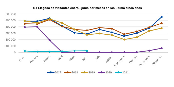 Au premier semestre 2021, les nuitées ont atteint 1.106.184, un chiffre bien inférieur aux 5.839.538 en 2020, et la contraction s’explique par le fait que l’île a réduit au minimum les vols internationaux en raison des infections au COVID-19 et il oblige actuellement les voyageurs à présenter un PCR négatif, réalisé au maximum 72 heures avant l’arrivée, un deuxième test dans le pays et une quarantaine de sept jours.
