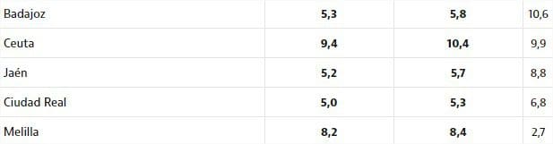 En bas du tableau, les plus faibles augmentations des prix de location au cours des cinq dernières années ont été enregistrées à Melilla (2,7 %), Ciudad Real (6,8 %), Jaen (8,8 %) et Ceuta (9,9 %). En fait, dans la ville autonome de Melilla, les prix ont baissé pendant deux années consécutives.