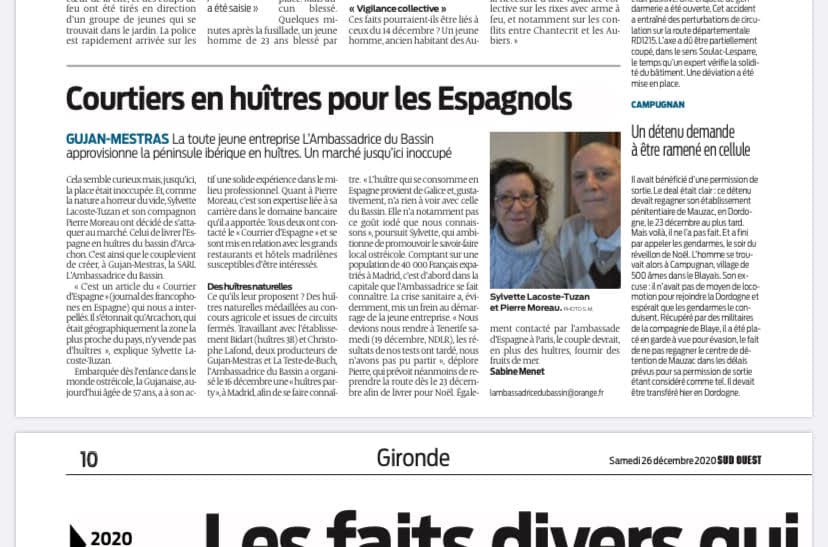 L’Ambassadrice du Bassin d’Arcachon, c’est le nom donné à cette jeune société du bassin créée il y a peu et dont le but et de livrer chaque semaine des centaines d’huîtres à Madrid alors que de nombreux français madrilènes recherchaient déjà à se fournir pour les f^êtes. Initiative reprise par nos confrères de Sud-Ouest..