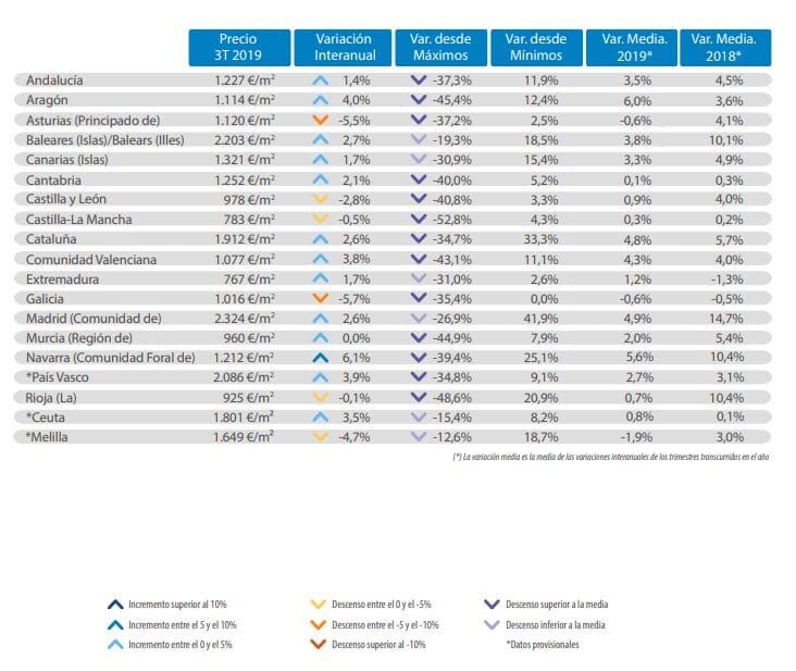 Les valeurs provinciales les plus élevées sont à Guipúzcoa (2.450 € / m2), à Madrid (2.324 € / m2 ), aux îles Baléares (2.203 € / m2 ) et à Barcelone (2.157 € / m2 ). Les plus basses, à Ciudad Real (619 € / m2), Teruel (704 € / m2 ), Cuenca (709 € / m2 ) et Lugo (734 € / m2 ).