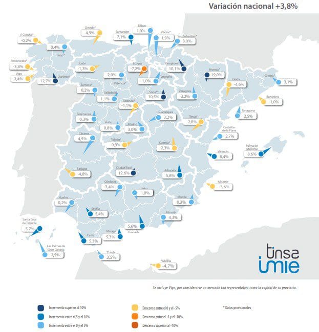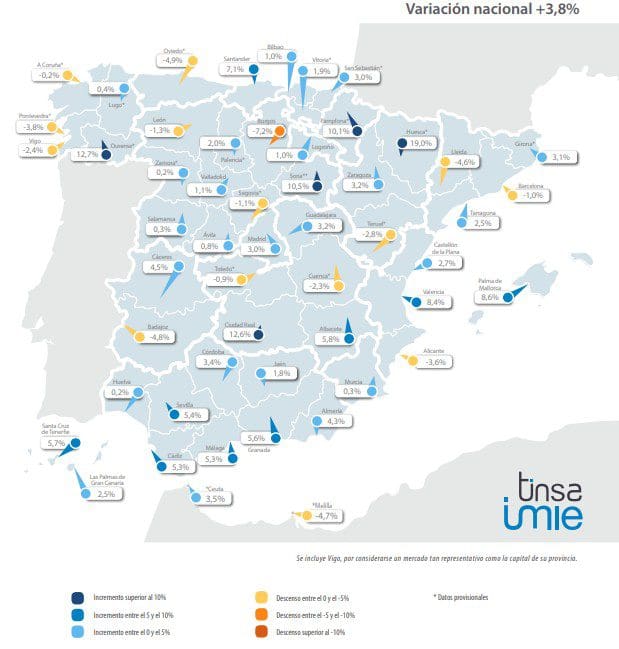 Les augmentations annuelles à deux chiffres dans les principales capitales provinciales ne sont plus notables. Valence et Palma de Majorque se maintiennent avec des chiffres supérieurs à 8%, Séville et Malaga un peu plus de 5% et Saragosse 3,2%. En ce qui concerne les deux plus grandes villes, Madrid affiche une augmentation de 3% et Barcelone affiche une valeur moyenne inférieure de 1% à celle du troisième trimestre de 2018.