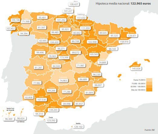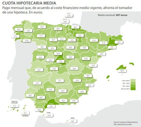 Le versement hypothécaire mensuel le plus élevé a été enregistré dans la province des Baléares (863 euros), suivi de Barcelone (757 euros) et Madrid (735 euros), bien au-dessus du paiement moyen effectué à Lugo (345 euros), Jaén (363 euros) et Cuenca (366 euros), provinces avec les quotas les plus bas.