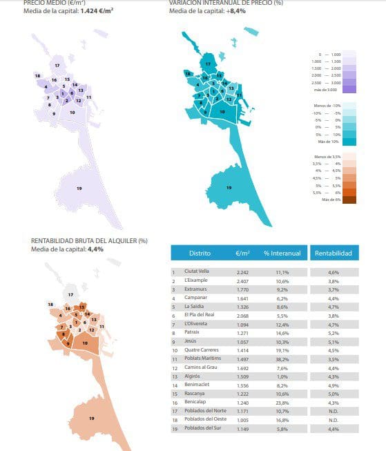 À Séville, Valence et Saragosse, la plupart des quartiers dépassent, avec différents montants, les valeurs du troisième trimestre de 2018, bien que ne soient pas des exceptions ceux qui enregistrent des ajustements de valeur trimestriels.