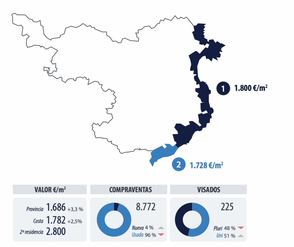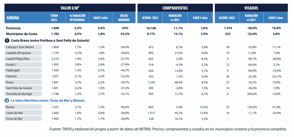 Le marché des communes côtières de Gérone a l’un des poids les plus faibles de la province, représentant 54% des ventes et des achats et 16% des approbations. En 2022, il a été plus dynamique en termes de ventes et d’achats et moins en termes de visas que l’ensemble de la province.
