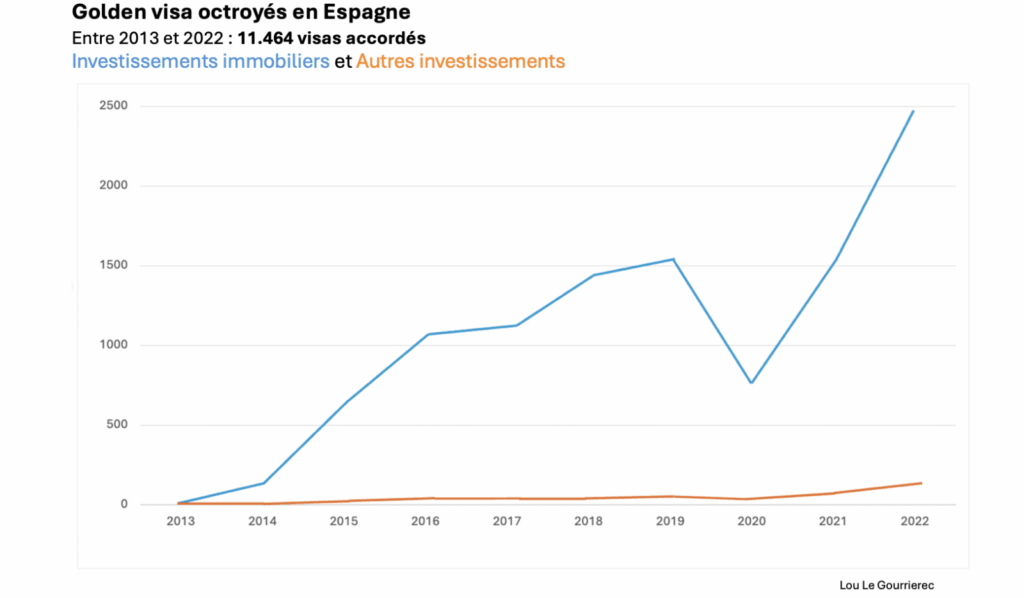 Approuvé en 2013 par le gouvernement PP de Mariano Rajoy, en pleine crise financière et suite à l’éclatement de la bulle immobilière, cette mesure avait pour but d’attirer les investisseurs étrangers à un moment où les grands capitaux se méfiaient de l’Espagne. Depuis lors, les gouvernements successifs ont accordé 11 464 permis de résidence pour des investissements étrangers, selon les données officielles jusqu’à la fin de 2022.