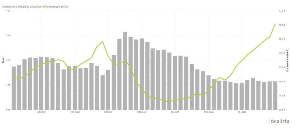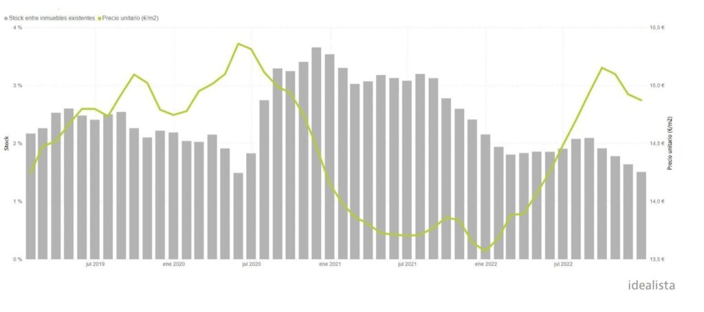 L’indicateur du parc locatif, c’est-à-dire le nombre de biens proposés par rapport au nombre total de logements existants, avait été inférieur à 1% en moyenne en Espagne en décembre 2022, exactement 0,85%, son plus bas niveau depuis mai 2020 (0,77%), selon l’étude idealista/data, en pleine période de confinement des Espagnols chez eux et de paralysie de l’économie en raison de la pandémie.