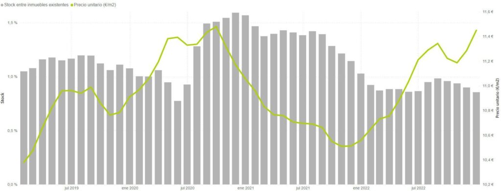 Au cours des mois suivants, on peut voir sur le graphique comment la baisse continue de l’offre de location s’est accompagnée d’une augmentation des prix. Au dernier trimestre de 2021, on aurait pu penser qu’il s’agissait d’un ajustement du marché, pour revenir à des chiffres similaires à ceux d’avant la pandémie, en baissant de plus de 1,3% à un peu moins de 1%.