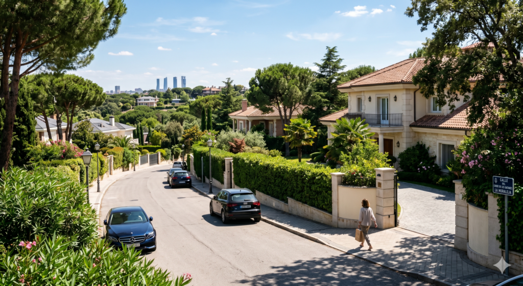 La Moraleja est sans doute la plus connue. Située dans la municipalité d’Alcobendas, à une quinzaine de kilomètres du centre de Madrid, elle s’étend sur environ 950 hectares dont 70 % couverts d’espaces verts, selon Idealista. Développée à partir de 1946 comme une cité-jardin résidentielle sur un ancien domaine royal ayant appartenu au patrimoine de Carlos III, elle abrite aujourd’hui des villas et manoirs dont les prix au mètre carré varient entre 5 500 et 10 000 euros selon BARNES Madrid, avec des propriétés pouvant dépasser 10 millions d’euros. Son golf privé l’un des plus prestigieux d’Espagne avec deux parcours de championnat et ses écoles internationales en font l’écrin de choix des familles fortunées.