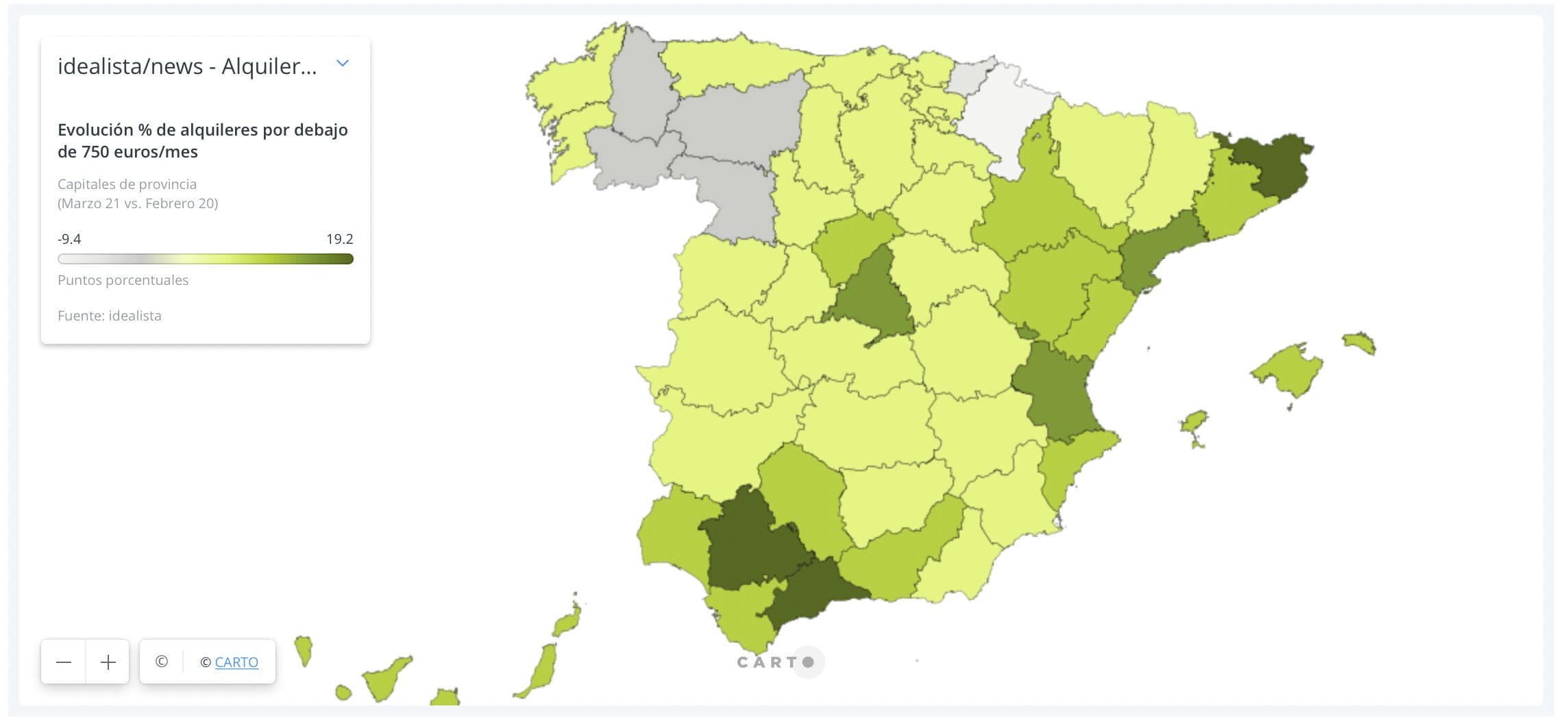 Les baisses du prix de location provoquées par l’augmentation de l’offre subie après le déclenchement de la pandémie et les mois d’enfermement ont fait croître considérablement le poids des logements locatifs en dessous de 750 euros. Si avant la crise sanitaire 34% des logements locatifs annoncés dans les capitales de province avaient un prix inférieur à 750 euros, en mars 2021 ce pourcentage est passé à 42% du total, selon une étude publiée par idealista, analysant la composition de sa location. base de données sur le logement au cours des mois de février 2020 et mars 2021 dans toutes les capitales provinciales espagnoles.(Idealista News)