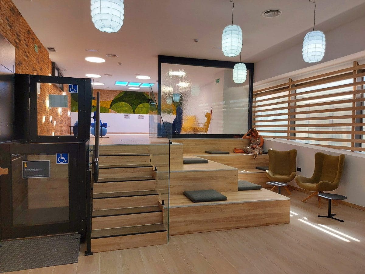 La “salle du silence” est structurée sur deux niveaux reliés par un escalier et une rampe d’ascenseur qui garantissent une accessibilité totale. Afin de rendre le temps d’attente des passagers plus agréable, il comporte des éléments tels qu’un jardin vertical de mousse, un panneau solaire, des marches avec des sièges relaxants et un mur d’eau.