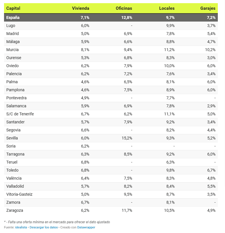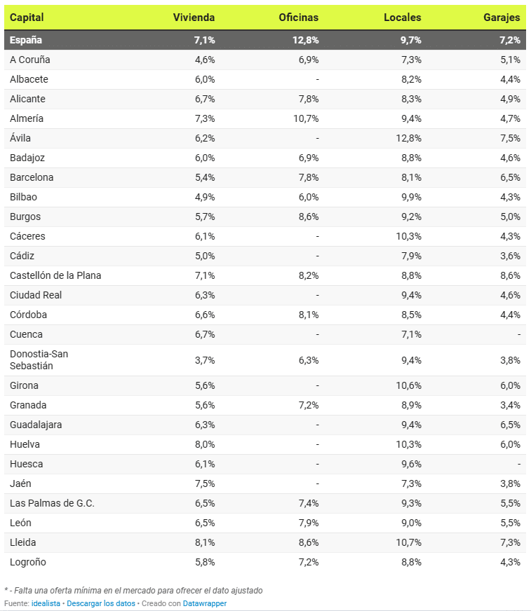 Les locaux sont le produit le plus rentable dans presque toutes les capitales. Les rendements les plus élevés sont obtenus à Ávila (12,8%), Murcie (11,2%), Santa Cruz de Tenerife (11,1%), Lleida (10,7%), Girona (10,6%) et Zaragoza (10,5%). Les rendements de Cáceres (10,3%), Huelva (10,3%) et Oviedo (10%) sont également supérieurs à 10%. À Barcelone, le taux s’élève à 8,1%, tandis qu’à Madrid, il est de 7,8%.
