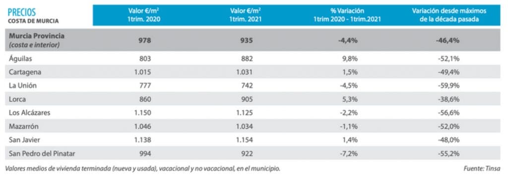 Le marché a connu une pause stable au cours de la période 2020, amorçant une légère reprise au cours des premiers mois de 2021. La région, une fine ligne côtière de près de 22 km, est clairement touristique, où un pourcentage élevé est une résidence secondaire, en particulier aux extrémités de La Manga. Après une période 2020 où la tendance à la croissance reprise depuis 2015 s’est interrompue, la réactivation se situe de préférence aux extrémités du littoral.