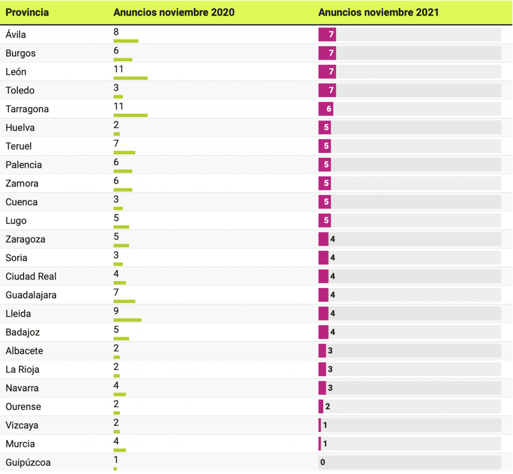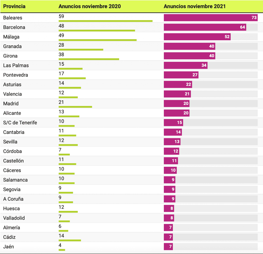 Cependant, le nombre d’hôtels annoncés sur Idealista a diminué dans certaines communautés par rapport à novembre 2020. C’est le cas d’Aragon (7 annonces de moins), Castilla y León (5 de moins), Región de Murcia (3 de moins), Euskadi (2 moins), Communauté de Madrid, Estrémadure et Navarre (avec une publicité de moins dans les trois cas).