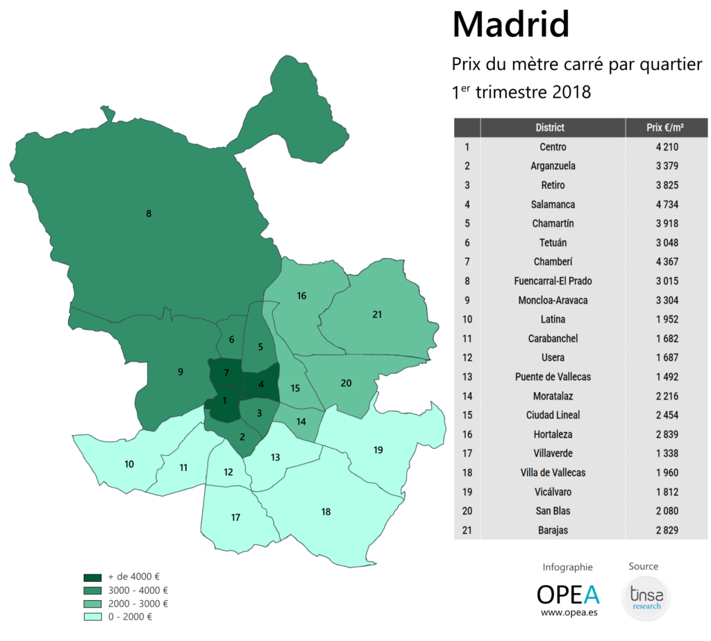 La forte croissance des prix l’année dernière a caractérisé tous les quartiers de la capitale espagnole. 15 des 21 districts de Madrid ont ainsi vu leur valeur moyenne augmentée de plus de 10 %, et même de 20 % pour Salamanca, Moratalaz et Centro.