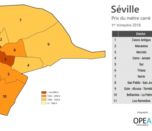 À Séville, la tendance est elle aussi très positive. Les districts Sur et San Pablo-Santa Justa, avec des augmentations de 11,7 % et 11,1 % respectivement, ont enregistré les plus fortes augmentations de ce premier trimestre 2018. Un seul quartier, celui de Nord, a connu une baisse par rapport à la même période l’année dernière, elle est de 1,1 %.