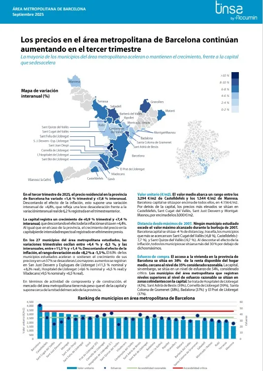 Les zones métropolitaines, les îles et les capitales et grandes villes sont les groupes qui ont connu la plus forte augmentation des prix en termes de taux mensuel et annuel. Tous les groupes analysés, à l’exception des « autres communes », ont enregistré des hausses supérieures à 10 % au cours de la dernière année. La valeur moyenne des logements en Espagne est inférieure de 1,7 % au sommet atteint en 2007 en termes nominaux.