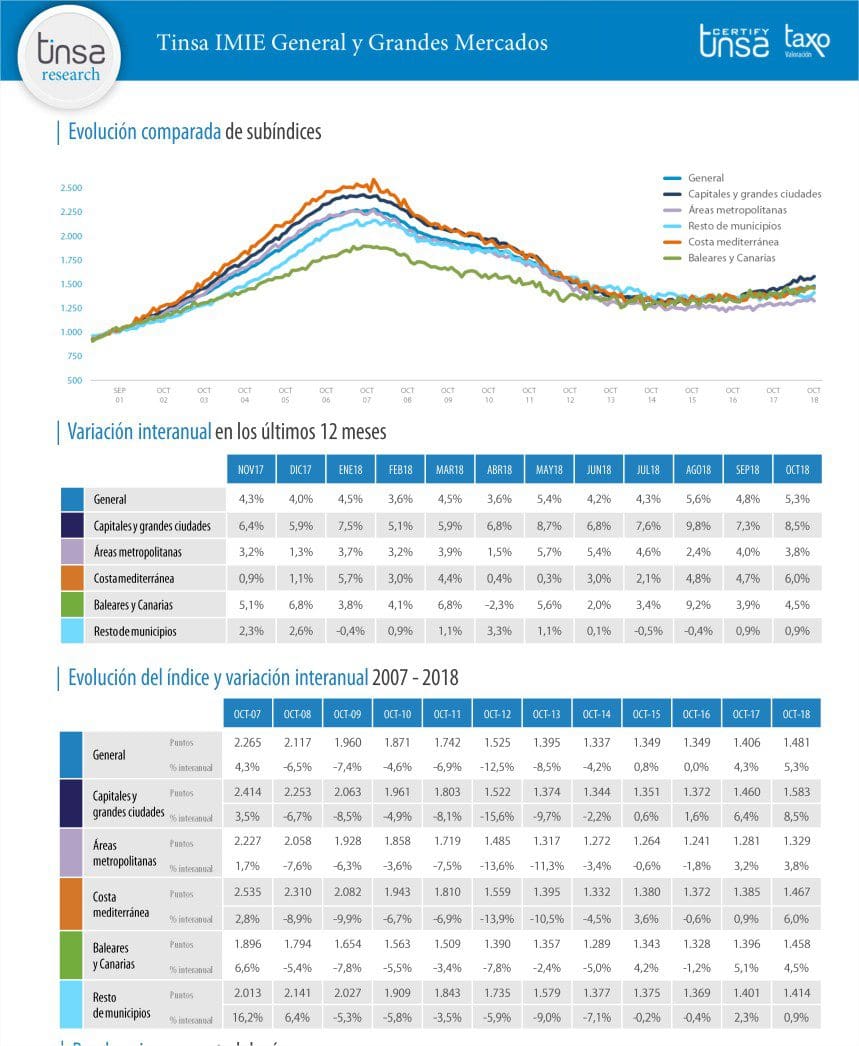 Le logement a enregistré une réévaluation annuelle moyenne de 5,3% en octobre, tirée par les capitales et les grandes villes, où la valeur moyenne a augmenté de 8,5% au cours de la dernière année (TINSA)