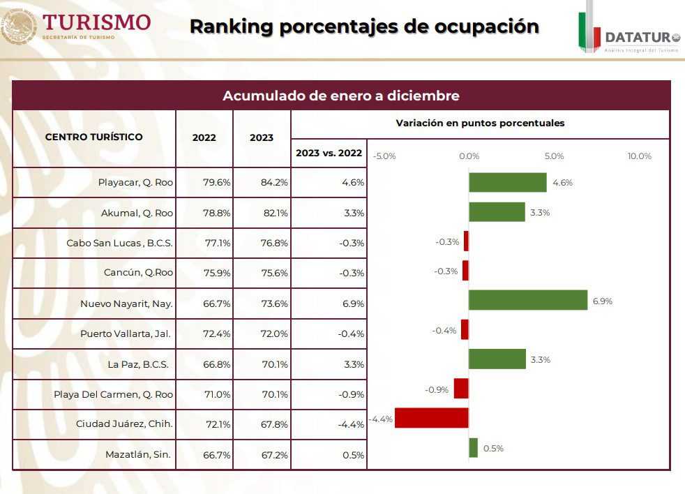 L’occupation hôtelière la plus élevée de janvier à décembre a été enregistrée à Playacar avec 84,2%, suivie par Akumal avec 82,1%, Cabo San Lucas (76,8%), Cancun (75,6%), Nuevo Nayarit (73,6%) et Puerto Vallarta (72%).