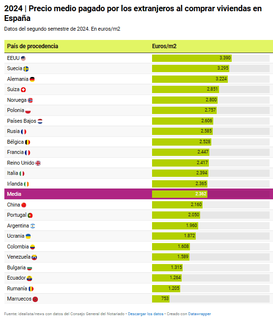 La hausse des prix de l’immobilier ne se fait pas seulement sentir au niveau des acheteurs nationaux, mais aussi au niveau des étrangers. Selon les données notariales, les étrangers ont payé un prix record pour l’achat d’un logement en Espagne au second semestre 2024, avec une moyenne de 2 362 €/m². Cependant, certaines nationalités ont déboursé plus de 3 000 €/m².