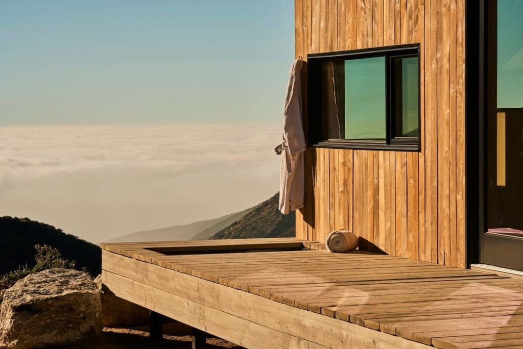 À l’intérieur, on retrouve également une douche à puits de lumière, un coin lecture de style loft, un foyer au bois, un lit queen et une grande terrasse avec une baignoire encastrée. La baignoire encastrée est installée dans un pont en sapin de Douglas et donne l’impression qu’ils flottent sur des nuages.