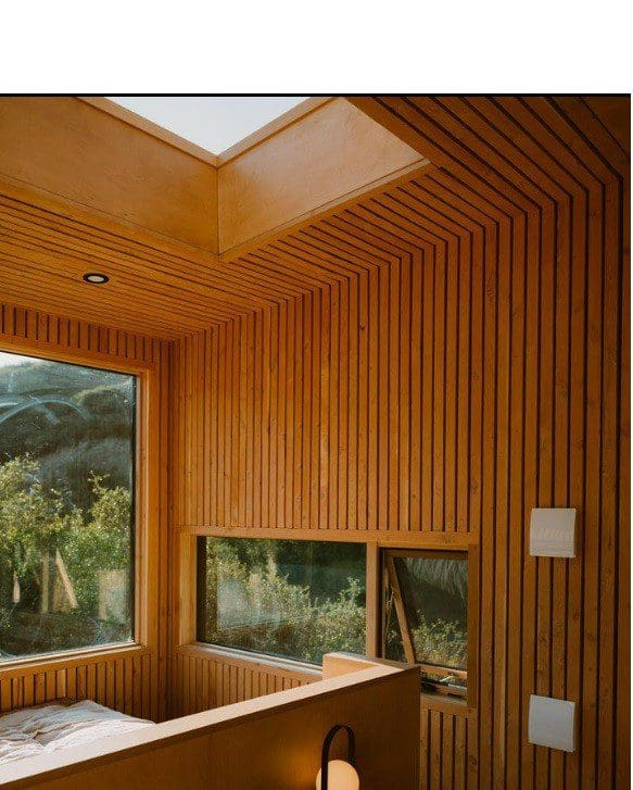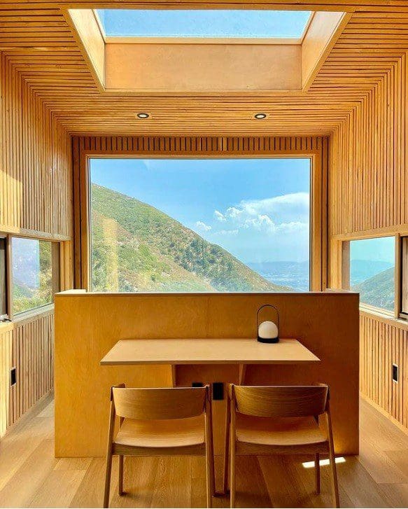 L’extérieur de l’armoire a été revêtu de sapin de Douglas à grain vertical, qui complète parfaitement les intérieurs en bouleau de la Baltique. Le bouleau est également légèrement teinté pour apporter une touche de chaleur et de texture. Le choix de ce matériau n’est pas accidentel, car il offre une bonne compatibilité des aspects esthétiques et fonctionnels, ainsi que sa résistance et sa capacité à créer une menuiserie propre. Des fenêtres impressionnantes couvrent les intérieurs, avec une vue imprenable sur les pins, le ciel et les nuages.