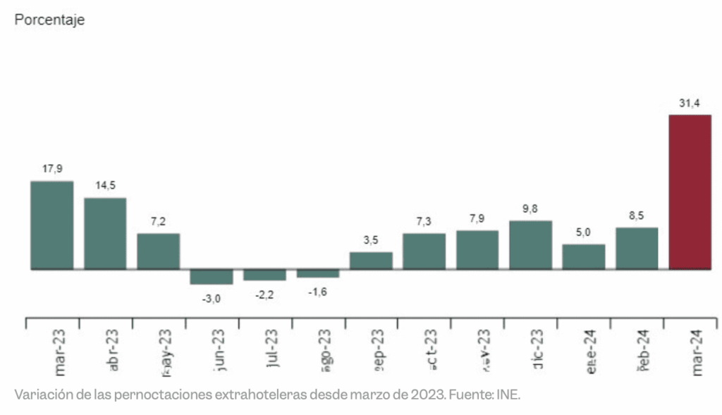 Au mois de mars, les nuitées dans les hébergements touristiques non hôteliers ont augmenté de 31,4% pour atteindre 9,24 millions, principalement grâce à la croissance enregistrée dans les campings et les hébergements de tourisme rural. L’enquête mensuelle de l’INE confirme que le séjour moyen a été de 4 nuitées par voyageur.