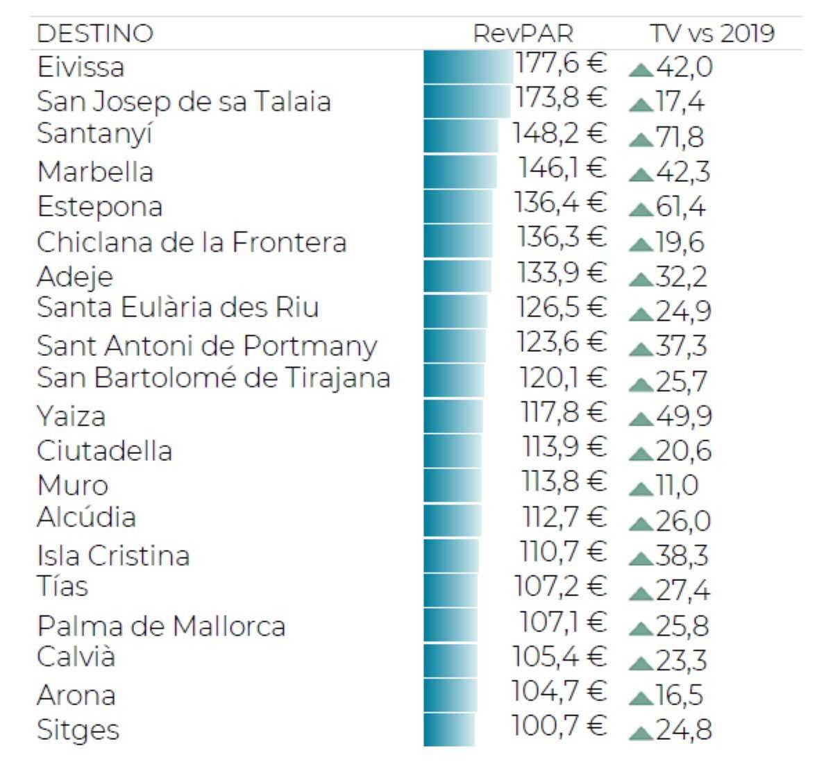 Sur les 105 enclaves couvertes par le Baromètre de la rentabilité et de l’emploi des destinations touristiques espagnoles d’Exceltur, 99 ont connu des améliorations, en tenant compte des recettes dérivées du RevPAR hôtelier (revenu par chambre disponible), qui a enregistré une augmentation moyenne de 26% par rapport aux niveaux d’avant la crise sanitaire. Il a atteint une moyenne de 77,1€ pour l’ensemble des destinations.