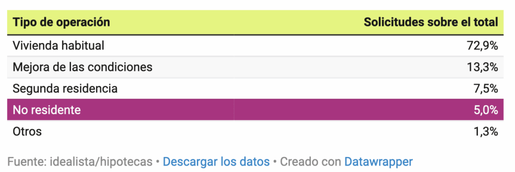 Après avoir analysé les transactions qu’il a négociées l’année dernière avec son service pour les non-résidents, le courtier en hypothèques d’idealista indique que les étrangers ont représenté 5% de la demande totale d’hypothèques pour l’ensemble de l’année, avec un poids similaire à celui des hypothèques pour l’achat de résidences secondaires (7,5%), bien que loin derrière les transactions visant à améliorer les conditions de l’hypothèque initiale (13,3%) et celles signées pour l’achat d’une résidence principale (72,9%).