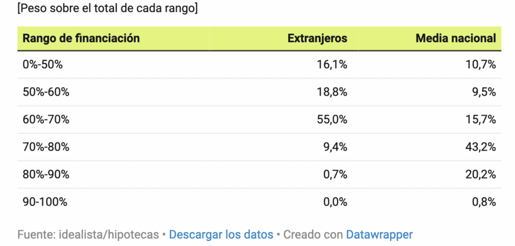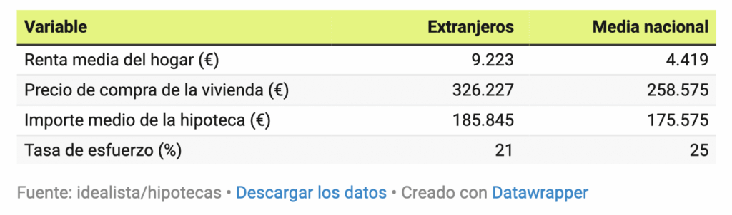 Sachant qu’ils demandent pratiquement le même financement, mais que les étrangers ont un revenu 2 fois plus élevé, leur effort économique (c’est-à-dire la part du revenu destinée au paiement de la mensualité) s’élève à 21%, contre 25% pour les Espagnols. Ces deux profils sont inférieurs au maximum de 30-35% recommandé par les experts.