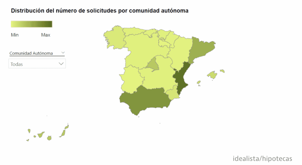 La zone méditerranéenne se distingue non seulement par le nombre de transactions signées, mais c’est aussi là que se concentre le plus grand volume de demandes de prêts hypothécaires pour l’achat de logements par des étrangers. Dans ce cas, le poids de la Communauté valencienne s’élève à 28,2%, tandis que l’Andalousie occupe la deuxième position (20,7% du total) et la Catalogne la troisième (14,7%). Les îles Canaries (9,48%), Madrid (9,43%) et les îles Baléares (5,36%) sont les régions les plus importantes du classement.