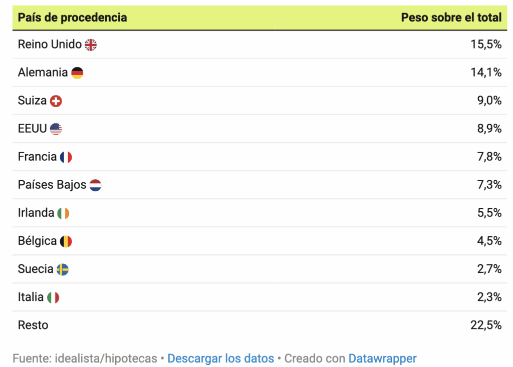 Une autre variable est que leur effort économique pour acheter une maison est de 21%, 4 points en dessous de la moyenne espagnole, tandis que les Britanniques continuent d’être la nationalité de référence, bien qu’ils soient suivis de peu par les Allemands.