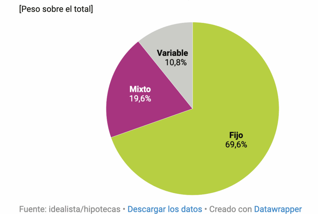 Les hypothèques fixes restent la principale option pour les étrangers en 2023, après avoir représenté près de 70% des opérations qui ont été formalisées l’année dernière par le biais d’idealista/hypothèques (69,6%). La 2ème typologie la plus importante est le type mixte (19,6%), tandis que les hypothèques variables restent l’option minoritaire (10,8%).