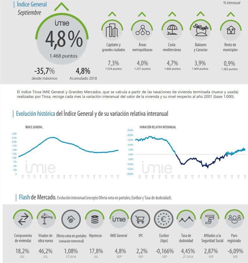 L’indice général Tinsa IMIE général et grands marchés a enregistré une croissance de 4,8% en septembre par rapport à l’année dernière, sous l’effet de “Capitales et grandes villes”, qui ont été réévaluées en moyenne de 7,3% au cours de la dernière année. Toutes les grandes zones analysées dans l’indice sont devenues plus chères au taux interannuel. Le prix moyen du logement en Espagne a augmenté de 12,1% depuis février 2015 et reste inférieur de 35,7% au maximum de 2007.
