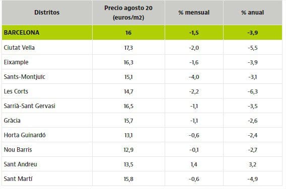 Malgré les baisses, Ciutat Vella reste le quartier le plus cher de la ville avec 17,3 euros / m2, suivi de Sarrià-Sant Gervasi (16,5 euros / m2) et de l’Eixample (16,3 euros / m2). En revanche, les prix les plus abordables sont jusqu’à présent à Nou Barris (12,9 euros / m2), Horta Guinardó (13,1 euros / m2) et Sant Andreu (13,5 euros / m2).