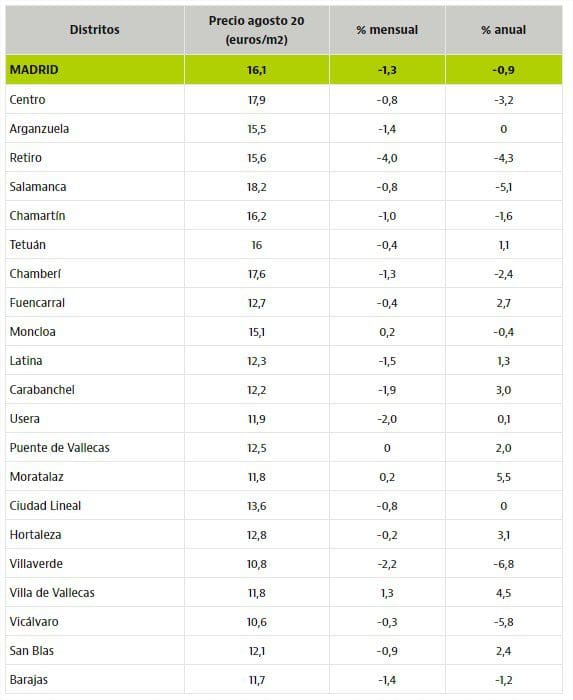 Malgré la baisse mensuelle à Salamanque de -0,8%, c’est toujours le quartier le plus cher avec 18,2 euros / m2, suivi par Centro (17,9 euros / m2) après une légère baisse de -0,8% , et Chamberí (17,6 euros / m2), qui a également perdu 1,3% sur un mois. La plus forte baisse le mois dernier a été au Retiro (-4%) pour laisser ses prix moyens à 15,6 euros / m2.