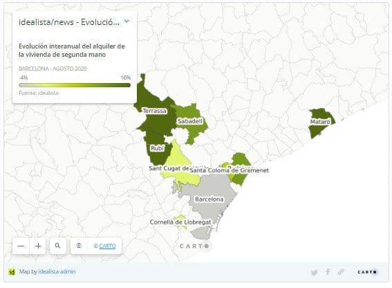 Dans la zone métropolitaine de Barcelone, quant à lui, seule Cornellá de Llobregat a enregistré des baisses de ses prix entre août 2019 et août 2020, de seulement 0,3%. Les plus fortes hausses ont été enregistrées à Rubí (15,6%), Mataró (8,9%) et Terrassa (7,3%). Quoi qu’il en soit, Rubí et Terrassa étaient deux des trois communes qui ont chuté en août dernier, respectivement -1% et -0,8%, avec Sant Cugat de Vallès (-1,1%).